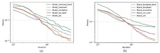 La Figura 5 muestra una gráfica logarítmica de la minimización de la función de Beale. Las figuras presentan resultados para 50 iteraciones (a) y 100 iteraciones (b), respectivamente. Las figuras (a) y (b) muestran el algoritmo Barabási (línea amarilla) con los mejores promedios en todas las iteraciones. El algoritmo evolutivo tradicional (línea verde) tiene los valores más altos en todas las iteraciones en ambas figuras y confirma que el enfoque novedoso tiene mejores resultados que el algoritmo evolutivo tradicional.