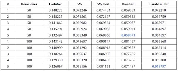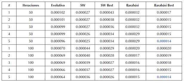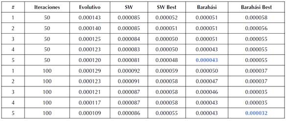La Tabla 5 presenta los mejores resultados promedio en una forma similar a las tablas anteriores. El algoritmo con mejor desempeño en ambos casos es Barabási Best, con un valor mínimo de 0.000014 para 50 y 100 iteraciones. El algoritmo evolutivo tradicional tiene las soluciones más altas: 0.000096 (50 iteraciones) y 0.000064 (100 iteraciones).