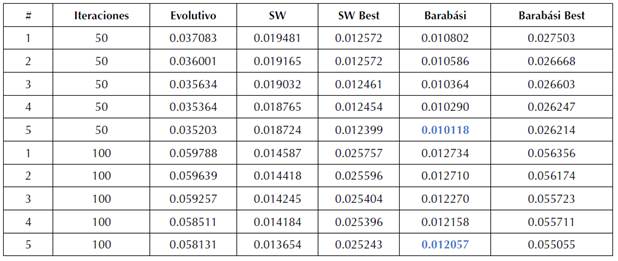 La Tabla 4 presenta los mejores resultados promedio en orden descendente para 50 y 100 iteraciones respectivamente. El algoritmo con mejor desempeño en las 50 iteraciones es Barabási 0.000043. Sin embargo, cuando llega a 100 iteraciones el mejor resultado promedio es Barabási Best 0.000032. Por otro lado, para ambos casos, los valores más altos se calculan mediante el algoritmo evolutivo tradicional con 0,000120 (50 iteraciones) y 0,000109 (100 iteraciones).