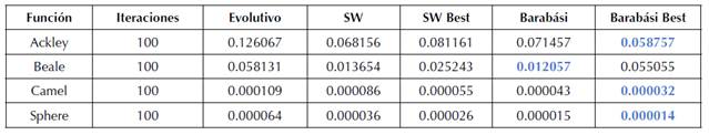 Se observó que los algoritmos propuestos presentan mejores resultados que las funciones de optimización (minimización) Ackley, Beale, Camel y Sphere. Así, para la función Sphere con pequeño mundo se obtiene 0,000025, mientras que Barabási Best mejoró los valores en 0,000006, pasando de 0,000020 a 0,000014. De los resultados observados en la función de Ackley, se obtiene 0.065348 en pequeño mundo, mientras que Barabási Best mejoró los valores en 0.013461, pasando de 0.072218 a 0.058757. En la función Camel se obtiene 0.000081 con pequeño mundo. Sin embargo, Barabási Best mejoró los promedios en 0,000026, pasando de 0,000058 a 0,000032. Estos resultados nos permiten concluir que el rendimiento de los algoritmos evolutivos mejora con alguna versión de la red libre de escala (Barabási o Barabási Best). En general, la red Barabási como mecanismo de control de combinación de soluciones es mejor que el algoritmo evolutivo tradicional o el algoritmo evolutivo guiado por redes de pequeño mundo.
