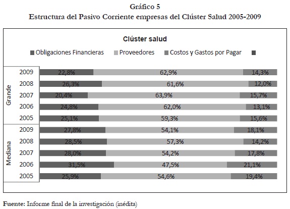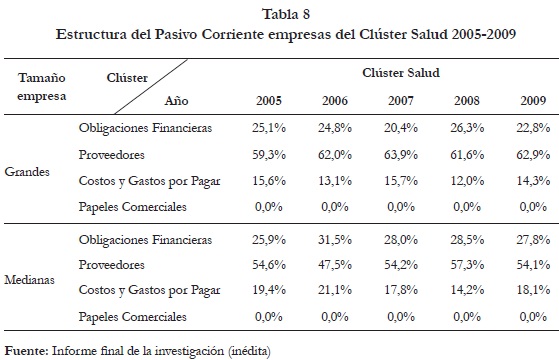 La tabla 8 muestra que tanto en las grandes como en las medianas empresas, la mayoría de los pasivos corrientes son financiados por los proveedores, seguidos por las obligaciones financieras y en menor proporción, por los costos y gastos por pagar. Se observa en el gráfico 5 que el comportamiento del pasivo corriente es estable para los dos tipos de empresas y que la financiación proveniente de los proveedores es mayor en el caso de las empresas grandes.