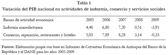La información presentada en esta sección se enfoca en el desempeño del sector real industrial y comercial12, específicamente el que está orientado a atender el mercado de la salud, mediante la fabricación de instrumentos médicos, ópticos, sustancias y productos químicos, maquinaria y equipos, entre otros. Se muestran datos correspondientes al crecimiento de la economía colombiana en las actividades de industria y comercio durante 2005-2009. Se incluyen también resultados del departamento de Antioquia relativos a exportaciones, importaciones y monto de colocaciones (las cuales permiten comparar si los resultados obtenidos con el endeudamiento de las empresas estudiadas, siguen el comportamiento obtenido a nivel departamental).