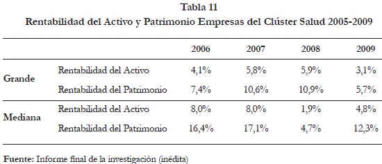 La rentabilidad del activo y del patrimonio es más alta en las empresas medianas con excepción del año 2008. Los resultados revelados en la tabla 11, sugieren que estas empresas fueron más sensibles a la crisis, ya que tanto las tasas de rentabilidad del activo y del patrimonio, se vieron disminuidas frente al año anterior en más del 76% y del 72% respectivamente; sin embargo, mostraron una recuperación importante en el año 2009 (incrementándose la rentabilidad del activo en más del 150% y la rentabilidad del patrimonio en más del 160%) mientras que para dicho período las empresas grandes exhiben los indicadores de rentabilidad más desfavorables.