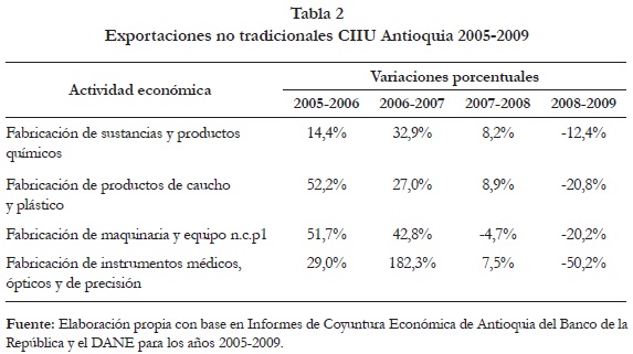 En las tablas 2 y 3 se muestran las variaciones en las exportaciones e importaciones de Antioquia, en las actividades económicas estudiadas y se comprueba la coherencia de estos resultados con los de la economía nacional. Se evidencia que los resultados más críticos para el sector externo corresponden a los bienes de capital en el período 2008-2009.