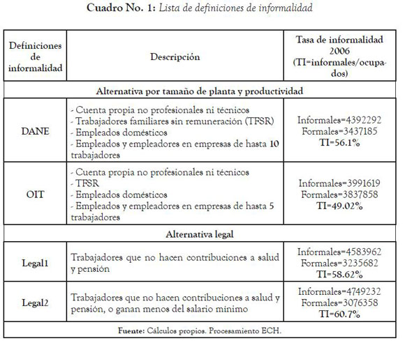 En el cuadro No. 1 se muestran las definiciones de informalidad que surgen de las dos alternativas antes citadas. Como medidas de informalidad de la alternativa por tamaño se siguen las convencionales definiciones del DANE y la OIT. Del lado de la alternativa legal, se definen dos medidas que son las más habitualmente utilizadas.