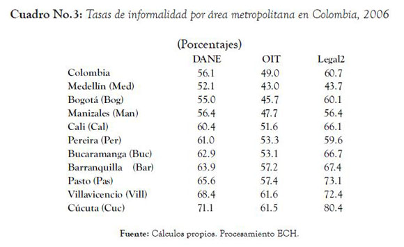 En Colombia, por su parte, según las cifras oficiales para el 2008 cerca del 58% del empleo lo genera el sector informal (DANE, 2009), mientras que Schneider y Klinglmair (2004) para el 2000 reporta que el 39% del PIB lo genera dicho sector. Unido a este comportamiento agregado de la informalidad, también existen diferencias a nivel de los mercados de trabajo locales. Las tasas de informalidad para las diez principales áreas metropolitanas de Colombia en el año 2008 muestran que Cúcuta, Villavicencio y Pasto presentan las tasas más altas, con 75%, 67% y 65%, respectivamente; Manizales, Medellín y Bogotá tienen los menores niveles de informalidad laboral, con tasas de 50%, 52%, y 54%, en el orden; y en un nivel intermedio en el empleo informal, entre los dos primeros grupos de ciudades se encuentran Pereira, Barranquilla, Cali, y Bucaramanga con tasas de informalidad de 59%, 60%, 60% y 62%, correspondientemente (DANE, 2009).