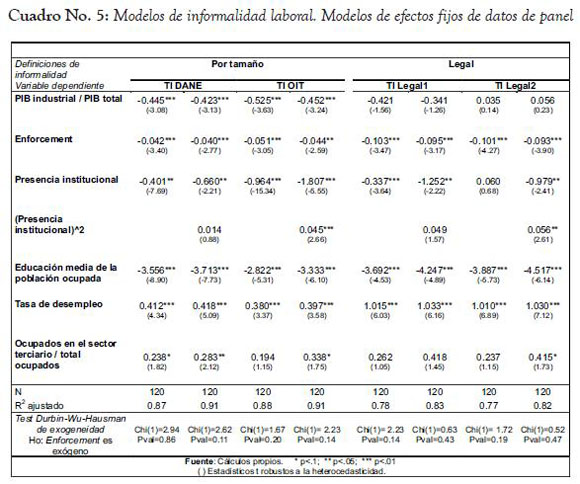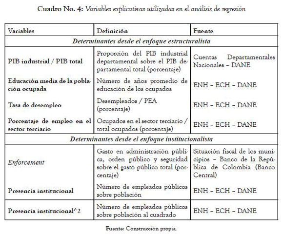 En el cuadro No. 4 se muestran las variables explicativas utilizadas y sus definiciones (véase el cuadro A2 de los anexos para algunas estadísticas descriptivas). Desde el punto de vista estructuralista se han incluido las siguientes variables: la participación porcentual del PIB industrial sobre el PIB total, el nivel promedio de educación de los ocupados, la tasa de desempleo y el porcentaje de empleo generado por el sector terciario. Por su parte, del lado institucionalista las variables incluidas son: Enforcement, que representa el esfuerzo que hace el gobierno para que los individuos y las empresas acaten las normas; y el grado de presencia institucional, tanto lineal como al cuadrado. Con la inclusión de esta última variable, tanto lineal como cuadrática, se pretende capturar el doble efecto que se ha distinguido en la anterior sección, en donde así como hay ciudades en las que una mayor presencia institucional genera un efecto negativo sobre la informalidad, en otras parece generar un efecto positivo.