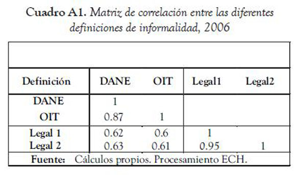Aunque las definiciones de informalidad por tamaño y legal tengan altas correlaciones (cuadro A1 de los anexos), es preferible analizarlas por separado dadas las diferencias conceptuales que existen y la posibilidad empírica de su caracterización. Para evitar extender el análisis en la siguiente sección, se utilizan las definiciones DANE, OIT y Legal2.