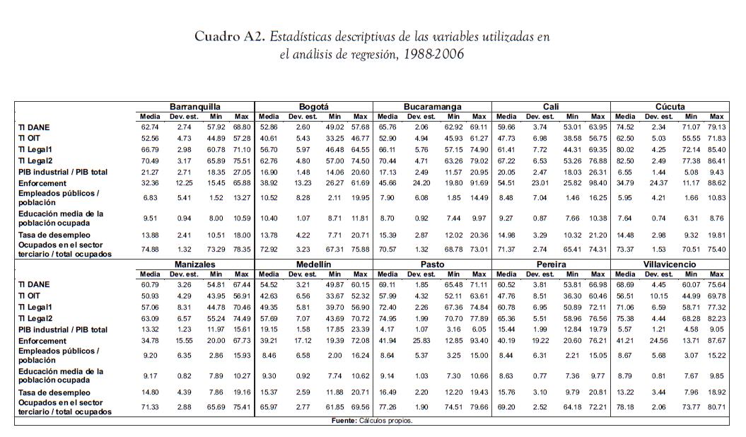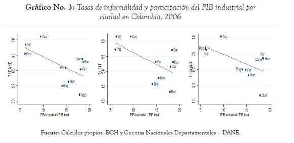 Ahora se pasa a analizar cómo es el comportamiento de la informalidad a nivel de los mercados laborales locales. En el cuadro No. 3 se muestran las tasas de informalidad para cada una de las diez principales áreas metropolitanas de Colombia para el año 2006. Al ordenar las ciudades por nivel de informalidad, se distinguen tres grupos: el primero está conformado por las ciudades con menores niveles de informalidad, estas son: Medellín, Bogotá y Manizales; le siguen en un nivel intermedio Cali, Pereira, Bucaramanga y Barranquilla; y por último, se encuentran Pasto, Villavicencio y Cúcuta, con altos índices de informalidad. En los dos primeros grupos están las ciudades con mayor desarrollo urbano, industrial e integradas comercialmente, mientras que en el último grupo están las ciudades con una menor dinámica y poca integración. Se empieza a distinguir que la informalidad presenta un importante componente local, en otras palabras, que las diferencias en los niveles de informalidad entre ciudades están asociadas a factores propios de cada una de ellas. Establecer cuáles son esas diferencias locales que afectan a la informalidad laboral es el objetivo en lo que sigue de esta sección.