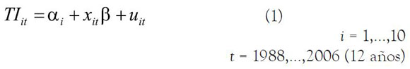 donde TIit es la tasa de informalidad de la ciudad i en el año t; xit es una matriz de variables independientes; β es un vector de coeficiente que se supone igual tanto por ciudad como temporal; αi es un vector de coeficientes del intercepto propio para cada ciudad y uit es un vector de perturbaciones aleatorias.