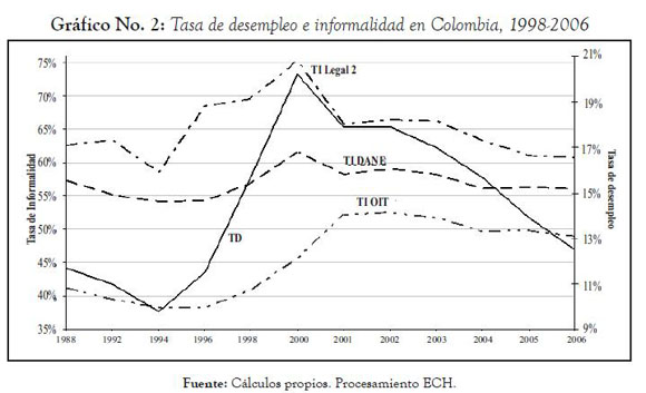 Otro patrón importante observado en la literatura es la relación entre la informalidad y el desempleo. En el gráfico No. 2 se observa una relación positiva entre estas variables: en períodos de crisis tanto el desempleo como la informalidad son altas y en el auge se presentan bajos niveles de desempleo e informalidad. Esta relación positiva puede deberse a que una parte de la informalidad es una respuesta al desempleo, es decir, que los individuos antes de quedarse sin empleo, prefieren ubicarse en la informalidad y sacrificar condiciones laborales.