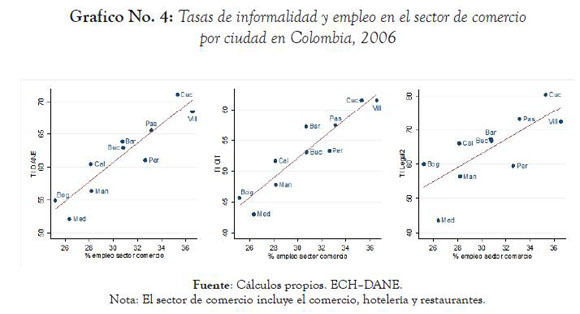 En la anterior relación entre alta informalidad y alto grado de empleo en el sector de comercio también aparece Barranquilla. En esta ciudad el 31% del empleo es generado por el sector de comercio y las tasas de informalidad superan el promedio nacional. Esta característica se debe al proceso de terciarización que ha vivido esta ciudad en la última década: Barranquilla ha pasado de ser una de las ciudades portuarias más importantes y generadoras de una buena parte del PIB industrial, a una ciudad de servicios y comercial, con una menor participación en el valor agregado nacional (Bonet, 2005 y 2007).