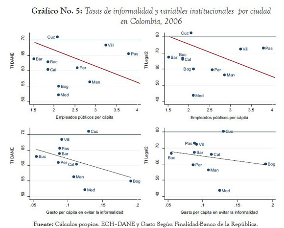 En el gráfico No. 5 se muestra la relación de las variables institucionales con la informalidad para cada ciudad. Respecto a la primera variable se observa que en el agregado existe una relación inversa con la informalidad, así una mayor presencia institucional que implica una mayor regulación, genera una reducción de los niveles de informalidad. Se observa también que se forman dos grupos de ciudades: en el primero la relación entre informalidad y presencia institucional es negativa y en el segundo están las ciudades en las que la anterior relación es positiva, es decir, ciudades con altas tasas de informalidad y alta presencia institucional. Esto último es el caso de Villavicencio y Pasto que presentan los valores más altos de empleados públicos por habitante y altas tasas de informalidad. Este doble efecto puede estar mostrando que un sector público muy grande se encuentra relacionado con procesos de burocratización y corrupción del aparato estatal, lo cual podría generar cargas legales adicionales a la formalidad y, por tanto, incentivar las actividades informales. En cuanto a la variable de esfuerzo institucional por evitar la informalidad, se observa que aquellas ciudades que destinan mayores recursos para tal fin, presentan menores niveles de informalidad.