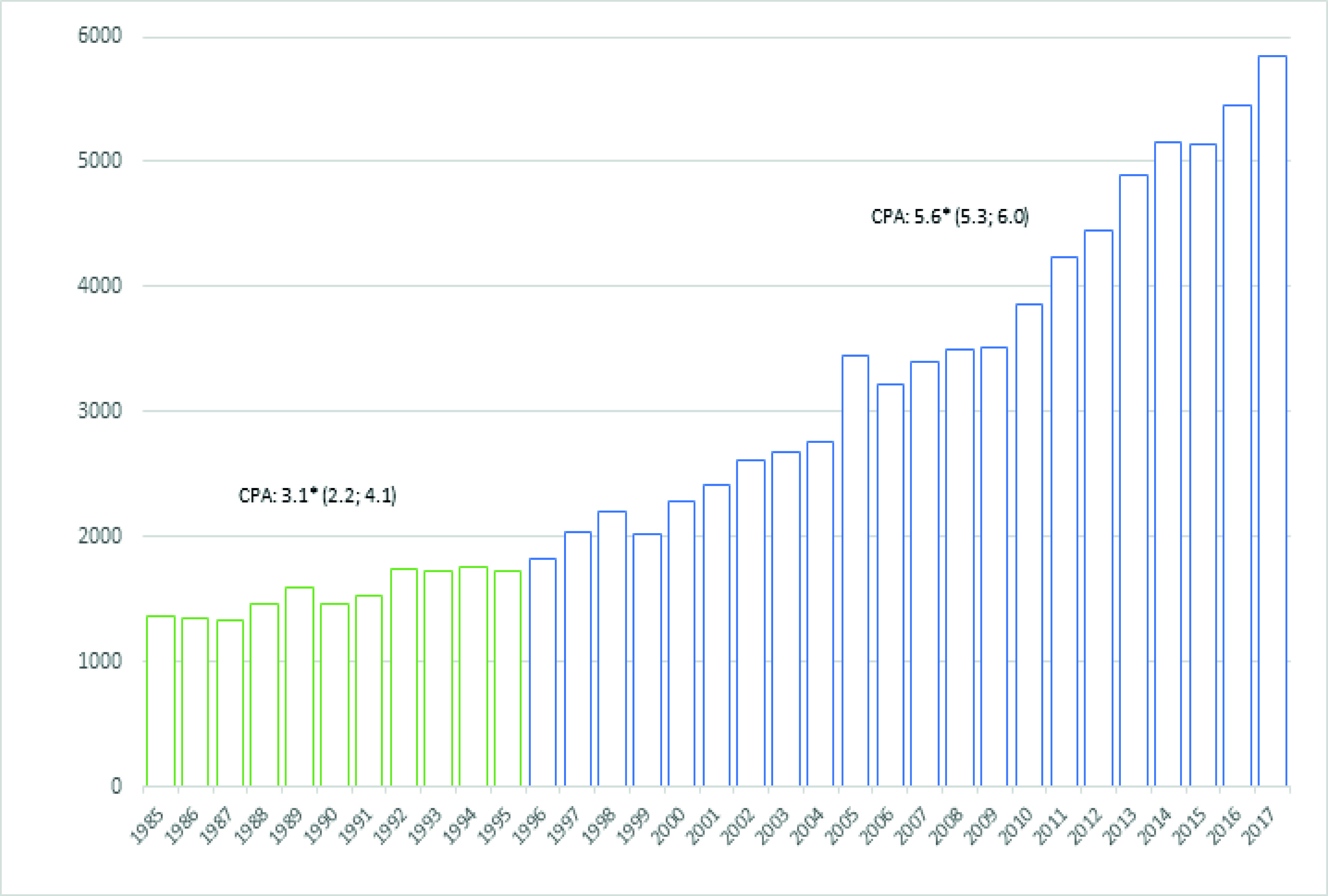 Desde 1985 hasta 2017 se diagnosticaron 93,821 casos nuevos de cáncer entre los residentes en la ciudad de Quito (Figura 2). El número de casos pasó de 1,355 en el año 1985 a 5,846 en el año 2017. La tendencia a lo largo de todo el período fue hacia un incremento, con ritmos diferentes en dos períodos, pasando de un CPA de 3.1 (IC 95%: 2.2-4.1) en el periodo 1985-1995, a un CPA de 5.6 (IC 95%: 5.3-6.0) a partir de 1996 (Figura 2).