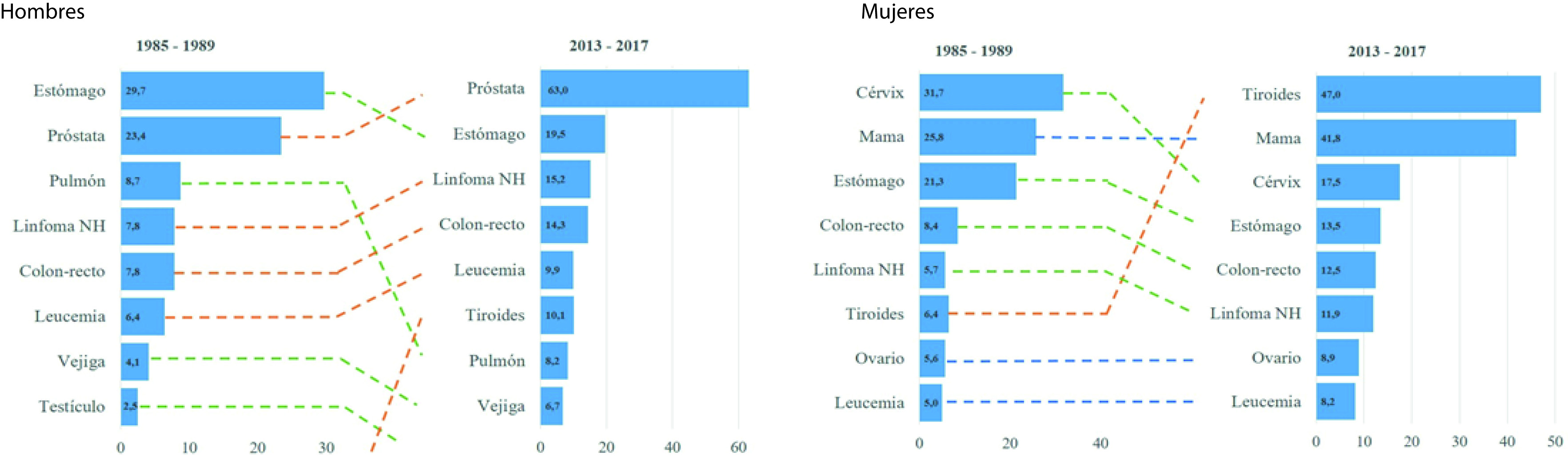 El análisis de los principales tipos de cáncer diagnosticados en la ciudad a lo largo del tiempo se puede observar en la Figura 3, construida a partir de una contrastación de las incidencias del periodo 1985-1989 y el último 2013-2017. Se evidencia cambios importantes en la ubicación que serán comentados más adelante.
