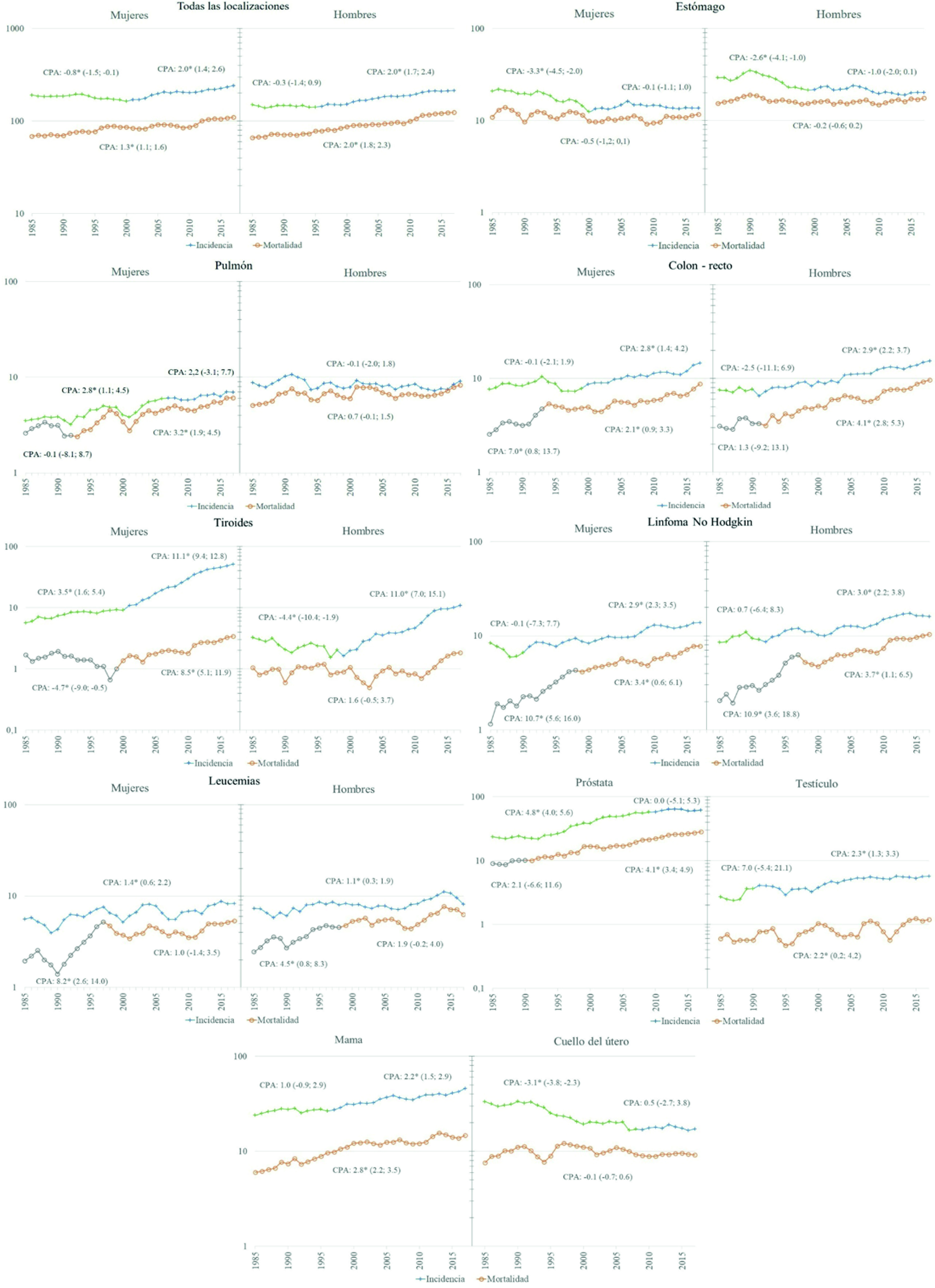 Durante todo el período de estudio, hubo un incremento sostenido tanto en las tasas de incidencia (CPA hombres= 2.0, IC 95%: 1.7-2.4; CPA mujeres= 2.0%, IC 95%: 1.4-2.6), como en las tasas de mortalidad (CPA hombres= 2.0%, IC 95%: 1.8-2.3; CPA mujeres= 1.3%, IC 95%: 1.1-1.6). La incidencia y mortalidad de los cánceres de mama, próstata, colon-recto, tiroides y linfoma se incrementaron, mientras que las tasas de incidencia de cáncer de cuello uterino y estómago disminuyeron inicialmente, luego se observó un estancamiento.