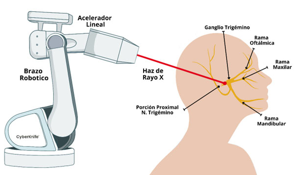 Radiosurgery by CyberKnife is not yet the first line of management in trigeminal neuralgia, however, it should be considered since several studies have managed to demonstrate an increase in the quality of life of patients and pain relief in refractory or severe cases. of said pathology.