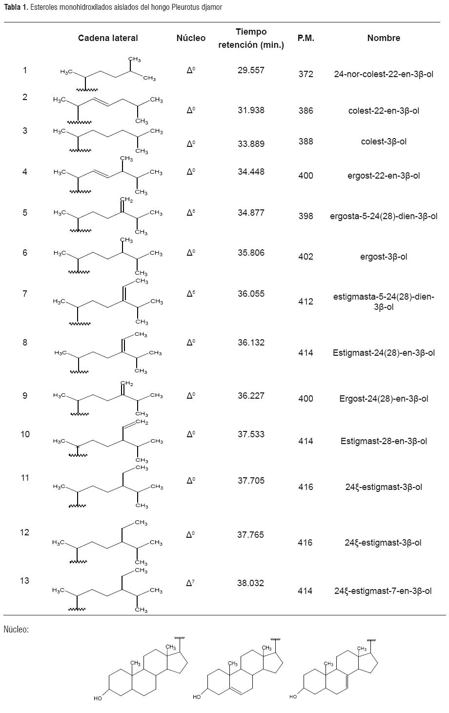 En la Tabla 1 se muestran los compuestos identificados en la fracción esterólica de Pleurotus djamor, y su movilidad cromatográfica (tiempos de retencion), se identificaron 13 compuestos, 10 de ellos con núcleo Δ0, otros dos con núcleo Δ5 y sólo uno con núcleo Δ7.
