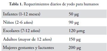 Los requerimientos diarios de yodo para humanos son los siguientes, Tabla 1 (11):