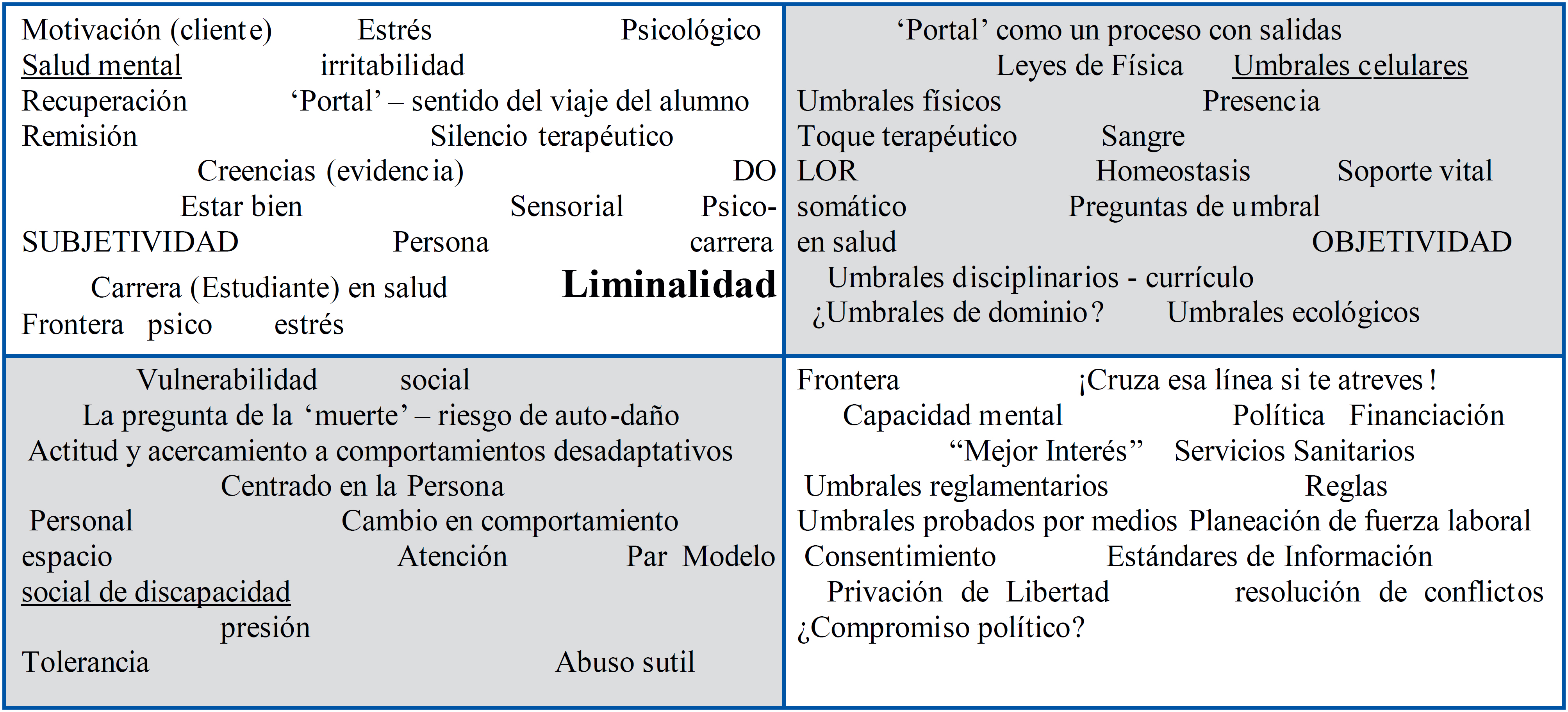 | Liminalidad | Meyer et al.11 han comparado el cruce del umbral pedagógico a un ‘rito de paso’ (basándose en los estudios etnográficos en los cuales un espacio transicional o liminal se tiene que atravesar; “en resumen, no hay un simple paso en el aprendizaje de “fácil” a “difícil”; la maestría de un concepto de umbral a menudo implica travesías desordenadas hacia atrás, hacia adelante y a través de terreno conceptual”. |