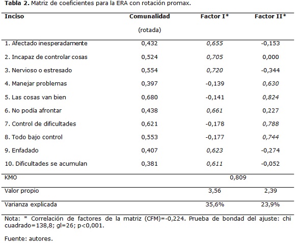 La prueba de unidimensionalidad presentó un coeficiente de Mosier de 0,68. En AFE el factor I dio cuenta del 35,6% de la varianza y el factor II del 23,9% de la varianza total. La correlación entre los factores fue negativa y la bondad del ajuste estuvo en valores no favorables -se debe interpretar con precaución-. El factor I, 'distrés general o percepción de estrés', presentó alfa de Cronbach y omega de McDonald de 0,82; el factor II, 'capacidad o habilidad de afrontamiento', presentó alfa y omega de 0,83 (Tabla 2).