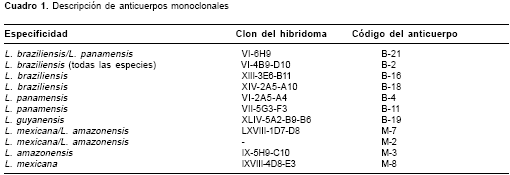Tipificación de los aislamientos. La tipificación de las especies se hizo mediante anticuerpos monoclonales (10). Se emplearon 11 anticuerpos monoclonales (cuadro 1), los cuales fueron producidos por McMahon Pratt y John R. David 1981 (11) y donados por el CIDEIM.