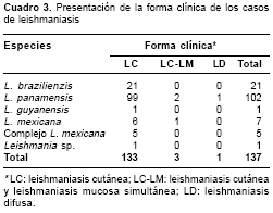 cuadro 3; se encontró que la forma más frecuente era la leishmaniasis cutánea (97,08%), seguida de la leishmaniasis cutánea y mucosa simultáneamente (2,19%) y, finalmente, la leishmaniasis difusa (0,73%).