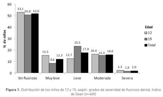 La prevalencia de fluorosis dental (proporción de niños que al momento del examen clínico presentaron fluorosis dental en los grados muy leve, leve, moderado o severo, de acuerdo con los criterios del índice de Dean) fue 48%. Al discriminar por edad, de los 213 niños de 12 años, 100 tenían fluorosis (46,9%); mientras que de los 187 de 15 años, en 92 se encontró fluorosis (49,2%). Por sexo, el 48,8% de las mujeres tenía fluorosis, en tanto que en los hombres la prevalencia fue 47,0%. Tabla 2.