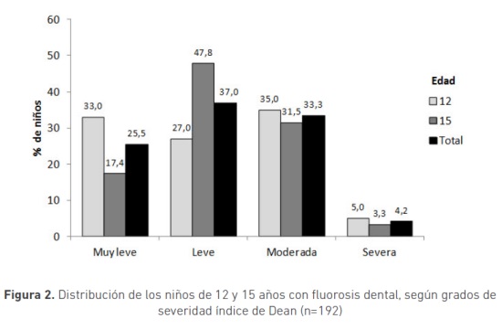 De los 400 niños de 12 y 15 años, que consultaron al servicio de odontología en 2014 a la ESE San Rafael del Municipio de Andes, el 30 % tenía fluorosis muy leve o leve, mientras que el 16% y el 2% tenían grados moderado y severo respectivamente. En la figura 1 se presenta la distribución de la prevalencia de fluorosis dental, según grados de severidad del índice de Dean.