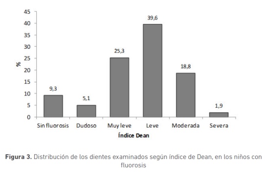En las investigaciones de este problema de salud bucal, el índice más utilizado es el desarrollado por Dean (1), que comprende diferentes grados de acuerdo con la severidad de afectación de la superficie dental (21). Los criterios para clasificar los hallazgos según la apariencia clínica del esmalte dental y el porcentaje de compromiso dental definidos por Dean comprenden cinco niveles de severidad. En el diente no afectado, definido como normal por Dean, el esmalte es translúcido, la superficie dental es lisa y brillante, y tiene un color blanco cremoso pálido. En el grado dudoso o cuestionable, el esmalte muestra ligeros cambios en la traslucidez que van desde unas pocas manchas blancas a manchas blancas ocasionales; esta clasificación se utiliza cuando no se justifica considerar la forma más leve de la fluorosis y además una clasificación de no afectado tampoco es adecuada. En este sentido con base en el índice de Dean, los casos identificados como dudosos se excluyen en el cálculo de la prevalencia de fluorosis dental.