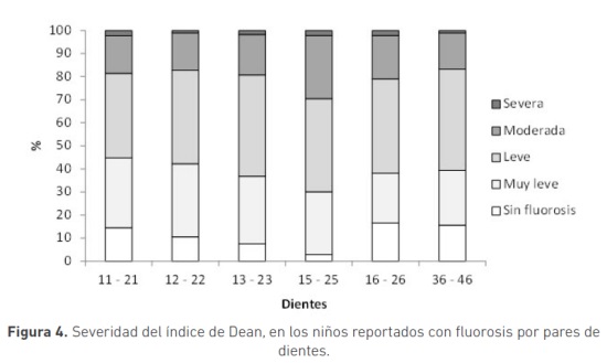 Los resultados de este trabajo evidencian una alta prevalencia de fluorosis dental, en los niños de 12 y 15 años que asistieron a consulta odontológica durante 2014 a la ESE Hospital San Rafael del municipio de Andes, con un 48% de los niños están afectados por fluorosis muy leve, leve, moderada o severa. Otros estudios realizados en los últimos años en el país, utilizando también el índice de Dean reportaron altas prevalencias del problema en población en edad escolar (22,23); situación que ha sido también reportada por otros países de la región (24-28). Así mismo, los resultados publicados recientemente del cuarto estudio Nacional de Salud bucal - ENSAB IV, reportan prevalencias de fluorosis dental de 65% y 56% en los niños de 12 y 15 años; respectivamente (29). Estos hallazgos llaman la atención acerca de un problema de salud bucal en aumento, y que ha sido documentado como un problema general en el país (30).
