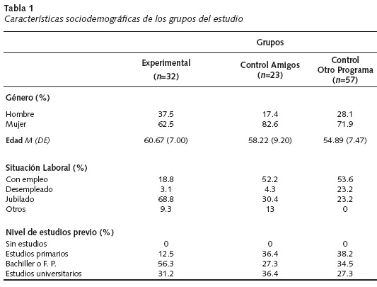 En el estudio se utilizaron tres grupos (N=112) seleccionados de forma incidental. El primero se configuró con 32 alumnos de la Universidad de la Experiencia, de la Universidad de La Rioja, que comenzaron sus estudios al inicio de la presente investigación. El primer grupo control estaba formado por 23 alumnos seleccionados por los propios estudiantes de la Universidad de la Experiencia entre sus amistades. El método utilizado para su elección fue incidental mediante el procedimiento bola de nieve. Se intentó seleccionar una muestra similar en género, edad, situación laboral y nivel de estudios previos, pero que no estuviera implicada en ningún programa educativo para adultos mayores. Por último, el tercer grupo estuvo formado por un total de 57 alumnos de un programa educativo no universitario para adultos y constituyó un segundo grupo control.