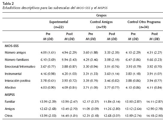 En la Tabla 2 se presentan los estadísticos descriptivos para las subescalas del MOS-SSS y del MSPSS en los dos momentos temporales y en los tres grupos.
