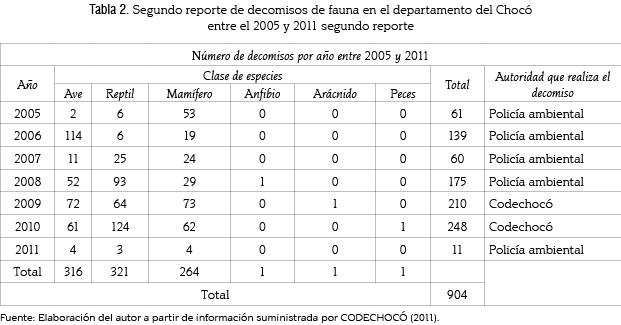 Sin embargo, no se puede dejar de presentar la inconsistencia de datos estadísticos que sobre los decomisos se encontró durante la investigación, ya que para el período 2010 y 2011 la autoridad ambiental, también reporta el decomiso de 316 aves, 321 reptiles y 264 mamíferos (CODECHOCÓ, 2011), (Tabla 2), para un total de 904 decomisos de especies de fauna en el departamento del Chocó. En este aspecto también, coincide con la tendencia nacional, de acuerdo con el precitado informe de la Procuraduría General de la Nación (2005), en cuanto a dificultades en la estandarización de las estadísticas de decomiso de fauna silvestre en el país. (Tabla 2)