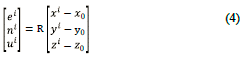 Where: (x i , y i , z i ) are the estimated coordinates in the ITRF, and (e i , n i , u i ) are the coordinates in the local topocentric system of station i, R is the rotation matrix presented by: