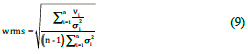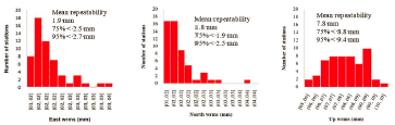 To estimate the accurate of the time series, we employ repeatability, a measure of the dispersion of positions. Repeatability can be calculated for baselines and positions. The position repeatability is defined as the weighted root mean square (wrms) of the residuals of positions around their average position (Nocquet, 2011):