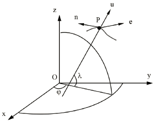 The online PPP processing services provide a positioning solution in the ITRF. The ITRF is defined as an ECEF (Earth Centered Earth Fixed) system with 3 coordinate components of x, y and z. To monitor the displacement of Earth's crust, the CORS coordinates need to be transformed from their geocentric ITRF system to their corresponding local topocentric system. This is represented by east (e), north (n), and up (u) components, as shown in Figure 3. This representation is physically meaningful because it separates the horizontal component (e, n) from vertical component (u).