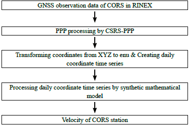 Step 3: Processing daily coordinate time series using the synthetic mathematical model. This involves solving for the harmonic components of annual motion and semi-annual motion, jumps (if any), and determining the displacement velocity of the CORS station.