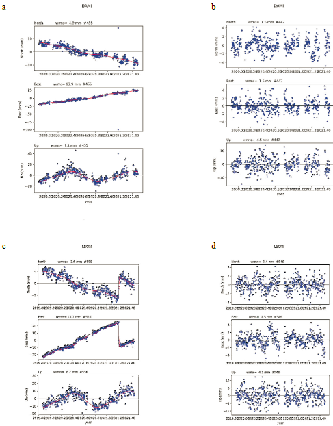 Figure 6 Processing the position time series of 2 typical CORS stations Figures (a) and (c) display the position time series of DAMI and LSON stations, represented by blue dots, with the estimated model shown as a red line. Figures (b) and (d) display the residuals time series of DAMI and LSON stations, with outliers, trend, and seasonal motion removed.