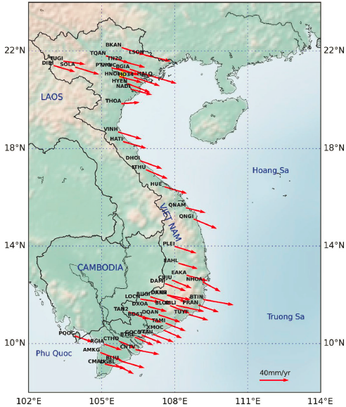 On the other hand, Vietnam faces faults in its land due to being located in the Sunda tectonic block, and the Indian plate's pressure on the Eurasian plate causing complicated Earth's crust displacements and deformations. Studies on tectonic displacement in Vietnam are limited until GPS become more widespread. For example, there have been studies on the tectonic displacement of active faults in northem Vietnam, such as the Lai Chau - Dien Bien, Son La, and Red River faults, using repeated GPS measurements (Cong Duong et al., 2006; D. T. Tran et al., 2013). However, the small relative displacements on these faults and the limited duration of repeated GPS measurement hinder the ability to provide reliable information.