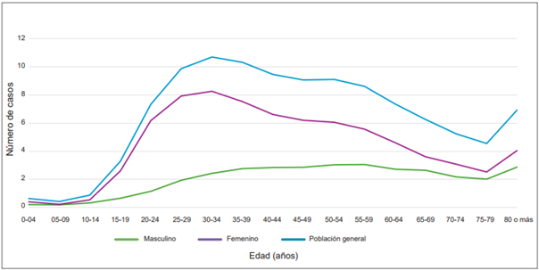 La edad se organizó en quinquenios, que comprenden rangos desde los 0 hasta los 80 años o más. Se observó un pico de presentación de la enfermedad en la población general a los 30 a 34 años, seguido de 35 a 39 años y posteriormente de 25 a 29 años. El pico de incidencia de la población femenina coincidió con el de la población general, y se observó un segundo pico a partir de los 80 años. No se encontró un pico de incidencia en la población masculina (Figura 1).