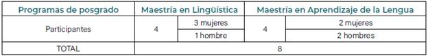 El CET estuvo constituido por ocho estudiantes de dos programas de maestría de una universidad pública del centro de México. Estas maestrías comparten docentes, algunos cursos y seminarios, si bien tienen perfiles de ingreso y egreso distintos. La participación de los tesistas fue totalmente voluntaria. A diferencia de lo que sucede en otros círculos de escritura en los que los participantes provienen de áreas disciplinares distintas (Colombo y Rodas, 2021), en este CET no se dio como variable ni la convivencia de discursos científicos diversos ni el contraste de procesos de investigación. En la Tabla 1 aparece la distribución de los participantes.