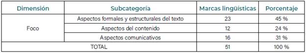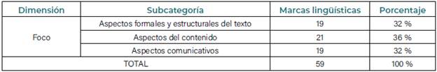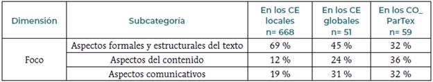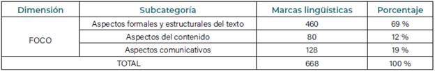 Con relación a las marcas lingüísticas de foco se categorizaron 668 dentro de los 640 CE analizados. Esto evidencia que la gran mayoría de los CE se centró en una sola de las tres dimensiones observadas: aspectos formales y estructurales del texto, aspectos del contenido o comunicativos. El orden de relevancia de esas dimensiones se muestra en la Tabla 6: el 69 % son marcas lingüísticas sobre forma y estructura, mientras que el 19 % señalan aspectos comunicativos y únicamente el 12 % se refiere al contenido.
