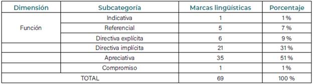 Finalmente, para categorizar las marcas lingüísticas que evidenciaban la función pragmática contenida en los comentarios se siguió la categorización de la Tabla 5.