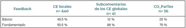 Como cierre de este apartado, se muestra un resumen de las comparaciones discutidas a lo largo de la exposición de los resultados. En la Tabla 12 se contrasta la fundamentación encontrada entre los CE locales, los CE globales y los CO_ParTex. Los comentarios de alcance global, tanto escritos como orales, fueron predominantemente fundamentados, a diferencia de los comentarios locales, en los que solo la mitad tenían aclaraciones o justificaciones de lo comentado.