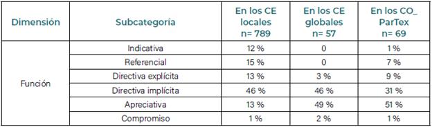 A diferencia de lo visto en los CE globales, en estos CO_ParTex sí aparecen marcas de todas las funciones, aunque algunas de ellas tienen una presencia muy baja, quedando las funciones directiva implícita y apreciativa como las dominantes. Todo esto se puede apreciar en la Tabla 11.