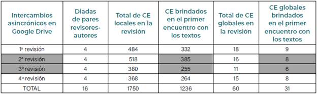 Asimismo, el análisis se concentra en los CE brindados en el primer encuentro con los textos en las dos revisiones intermedias del CET (2a y 3a). Esto implicó tomar 640 CE locales, los cuales están sombreados en la cuarta columna de la Tabla 2. Esta cantidad corresponde al 36.6 % del gran total de los 1750 CE locales obtenidos en todas las revisiones del CET; sin embargo, en cuanto a los 1236 CE del primer encuentro con los textos, los 640 CE analizados representan el 51.7 %.
