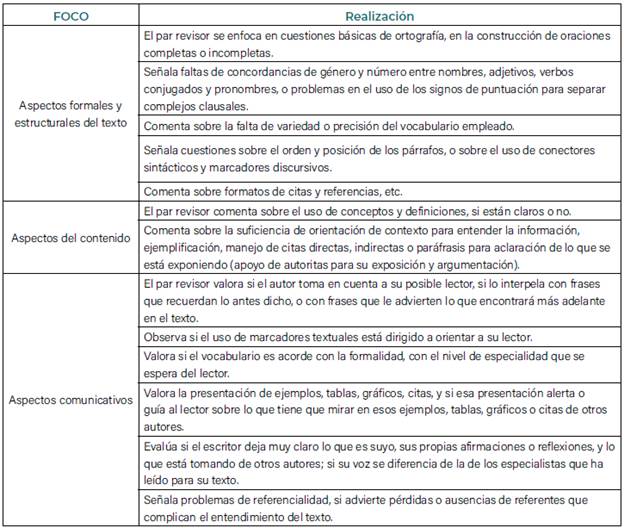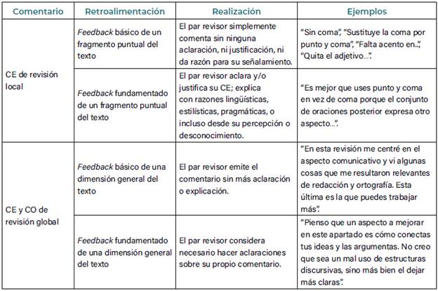 Para identificar marcas lingüísticas dentro de los distintos tipos de comentarios que explicitaran los aspectos en los que se enfocaba la revisión, se aplicó la siguiente categorización (Tabla 4).