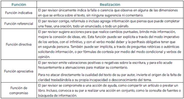 De manera similar se ha puesto atención en las principales funciones pragmáticas de los comentarios (Álvarez y Difabio de Anglat, 2019; Cano et al., 2012; Kumer y Stracke, 2007), distinguiendo entre meras indicaciones o señalamientos, ordenamientos de manera directa o implícita, o incluso valoraciones y apreciaciones atenuadas o más emocionales, pues la manera de comunicar los comentarios es una preocupación por parte de quienes han observado el intercambio entre pares aprendices (Carlino, 2005) y su aceptación (Corcelles et al., 2013). Si se quieren constatar los beneficios de dispositivos didácticos como los grupos de escritura, esta es una información indispensable. Dentro de la caracterización de los comentarios interesa sopesar la fundamentación de quienes comentan a través de justificaciones, explicaciones o argumentaciones de los señalamientos sobre lo que observan en los textos.