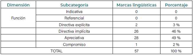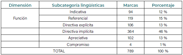 En la Tabla 7 se observa la distribución de las 789 marcas lingüísticas de función.